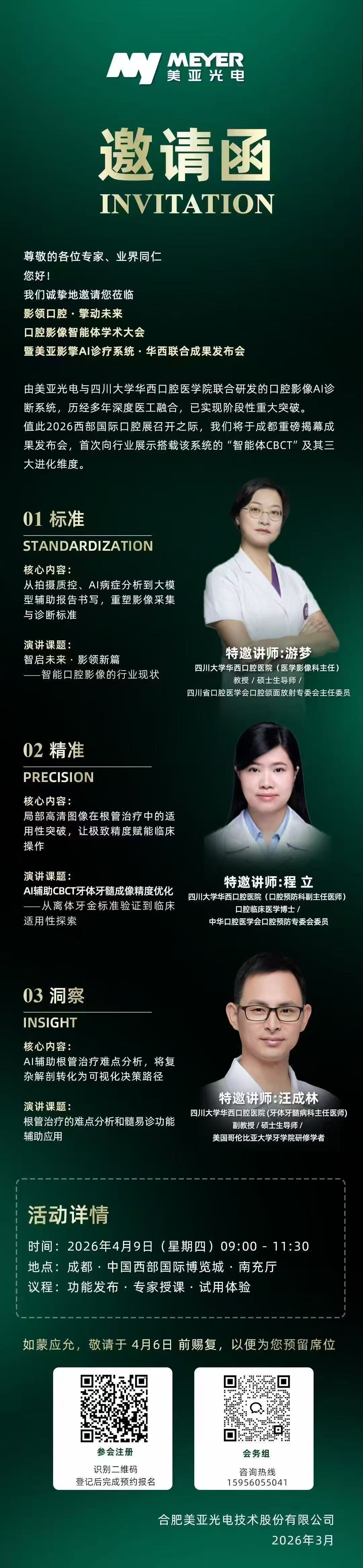 由美亚光电与四川大学华西口腔医学院联合研发的口腔影像AI诊断系统,历经多年深度医工融合,已实现阶段性重大突破。值此2026西部国际口腔展召开之际,我们将于成都重磅揭幕成果发布会,首次向行业展示搭载该系统的"智能体CBCT”及其三大进化维度。
